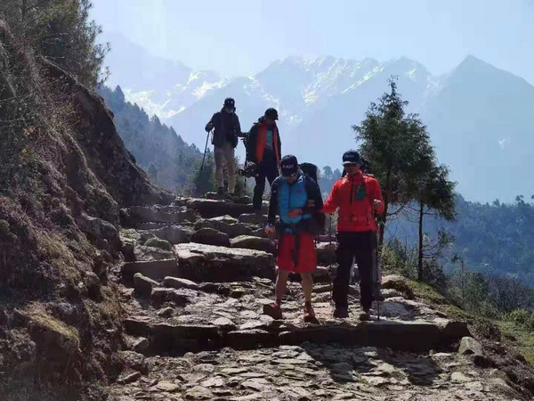 抵達尼泊爾首都加德滿都之后,2021年4月3日,張洪及團隊開始徒步進山,走珠峰大本營路線(EBC)。這一路都是雪山美景,張洪不斷聽到同行者的贊美聲。走了近四小時后到達當天的休息點帕丁克小鎮(zhèn)(海拔約2600米)。