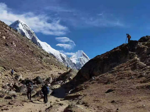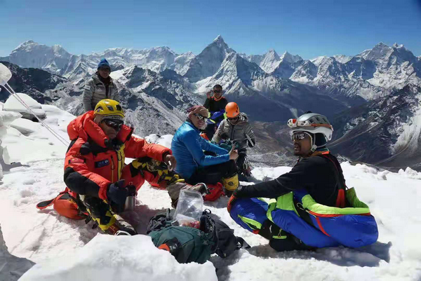 這一路,張洪遇到了來自世界各地很多志同道合的朋友,彼此間的交流與鼓勵,給予了他很大動力。之后幾天,張洪又進行了幾次拉練,并在4月19日成功登頂海拔6119米的羅波切峰。