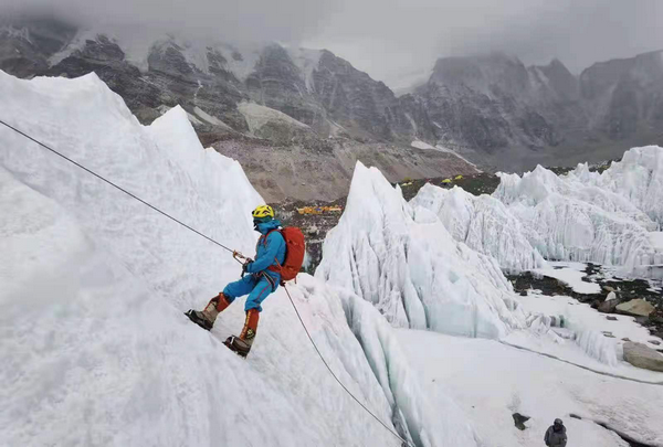 要攀登珠峰,昆布冰川是第一道門檻。4月25日,張洪及團隊一起走向昆布冰川進行實地拉練。