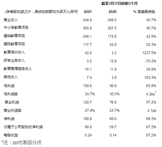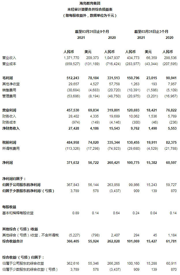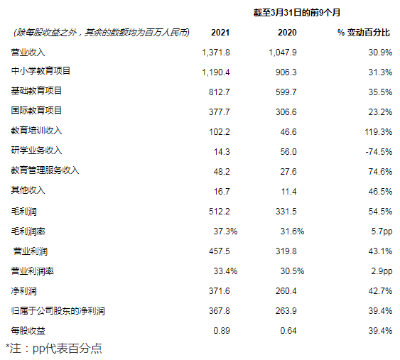 “延續(xù)2021財(cái)年上半年強(qiáng)勁的增長,公司在2021財(cái)年第三季度仍然保持了非常好的上升勢頭。我們2021財(cái)年第三季度的營業(yè)收入達(dá)到人民幣4.348億元(6,636萬美元),較去年同期的人民幣2.985億元增長45.7%。毛利潤達(dá)到人民幣1.508億元(2,302萬美元),較去年同期增長65.9%。毛利率從去年同期的30.5%提升至34.7%。營業(yè)利潤達(dá)到人民幣1.207億元(1,842萬美元),同比增長57.2%。歸屬公司股東凈利潤為人民幣9,987萬元(1,524萬美元),較去年同期的人民幣5,973萬元增長67.2%,”海亮教育董事會(huì)主席兼首席執(zhí)行官陳軍偉博士評(píng)論道,“憑借這個(gè)財(cái)年日益深化的精細(xì)化管理及預(yù)算管控,2021財(cái)年前九個(gè)月的收入、毛利潤、營業(yè)利潤、歸屬公司股東凈利潤也分別同比增長30.9%、54.5%、43.1%、39.4%?!?/p>