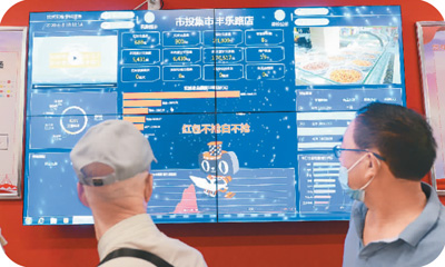 由河南省鄭州市市場(chǎng)發(fā)展投資有限公司打造的國(guó)有公益性農(nóng)貿(mào)市場(chǎng)“市投集市豐樂(lè)農(nóng)貿(mào)市場(chǎng)店”,配套了智慧化管理系統(tǒng)。圖為顧客在觀看大屏幕上滾動(dòng)播報(bào)的場(chǎng)內(nèi)交易信息。張濤攝(人民視覺(jué))