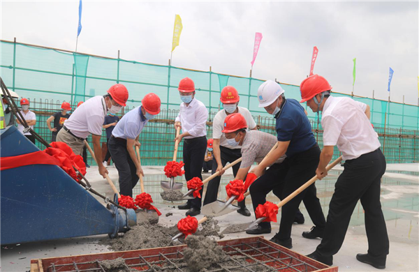 儀式最后,各單位代表鏟混凝土共同進(jìn)行了封頂。