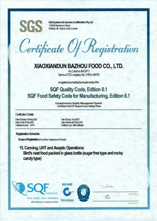 小仙燉鮮燉燕窩工廠一舉獲得包括燕窩產(chǎn)品溯源認(rèn)證體系、SQF體系、GMP體系、FSSC22000管理體系、ISO22000管理體系、China-HACCP管理體系和ISO9001體系在內(nèi)的七大體系認(rèn)證。這對(duì)于一家成立僅7年的企業(yè)來(lái)說(shuō)難能可貴。