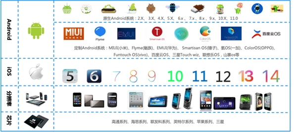 App兼容性問題出現(xiàn)的原因很多,如手機數(shù)量多,手機碎片化,操作系統(tǒng)版本各異,屏幕分辨率眾多,系統(tǒng)定制化以及手機設(shè)備硬件參數(shù)各異……如下圖所示: