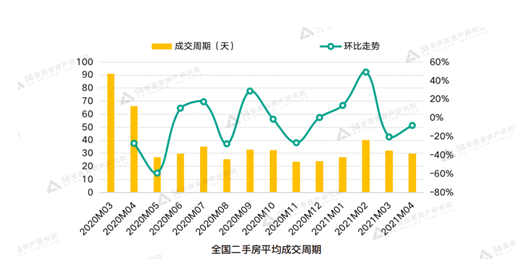 58同城、安居客《2021年4月全國二手房市場報告》數(shù)據指出,在成交周期上,4月全國二手房成交周期約為30天,環(huán)比下滑8%,且成交周期連續(xù)兩個月出現(xiàn)縮短。而從各區(qū)域來看,中西部的平均成交周期在45天,較其他大區(qū)多10天左右,但是從環(huán)比情況來看,相較3月份都出現(xiàn)不同程度的下滑。