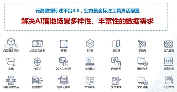 在AI數(shù)據(jù)標(biāo)注過程中,數(shù)據(jù)標(biāo)注同樣面臨“種類繁多、時(shí)間效率、數(shù)據(jù)質(zhì)量”等眾多難題。而云測數(shù)據(jù)標(biāo)注平臺(tái)4.0擁有業(yè)內(nèi)最齊全的標(biāo)注工具,并且可以靈活配置,完美解決AI落地場景多樣性、豐富性的數(shù)據(jù)需求。