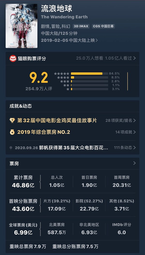 《流浪地球》故事設(shè)定在未來的2075年,當(dāng)太陽即將毀滅,地球不適合人類生存時(shí),人類開啟了"流浪地球"計(jì)劃。影片一上映便引起熱烈討論,通過全網(wǎng)抓取數(shù)據(jù)顯示,《流浪地球》相關(guān)話題全網(wǎng)共提及8690884次。無論專業(yè)影評(píng)人或是觀眾均表示這部電影“讓國內(nèi)觀眾看到了中國科幻片的未來”,最終《流浪地球》以46.86億的票房成績位居中國中國電影票房榜第四名。