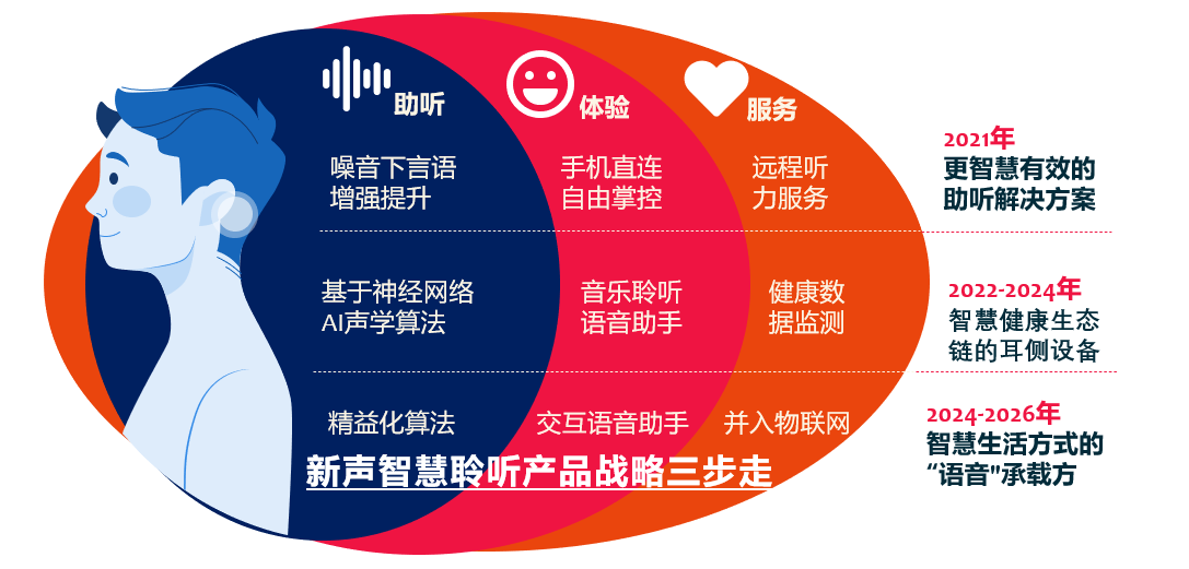 大會上,新聲技術(shù)首席官李伯陽表示新聲的“智慧聆聽“產(chǎn)品戰(zhàn)略,旨在為用戶提供互聯(lián)智能、富場景應(yīng)用、數(shù)字化護(hù)航的全新聽力健康服務(wù)。它包含3個(gè)階段,初期工具化助聽器,單一解決助聽需求;中期個(gè)性化助聽器,助聽+個(gè)性化聆聽;成熟期智能化助聽器,助聽器+自然交互+健康服務(wù)。