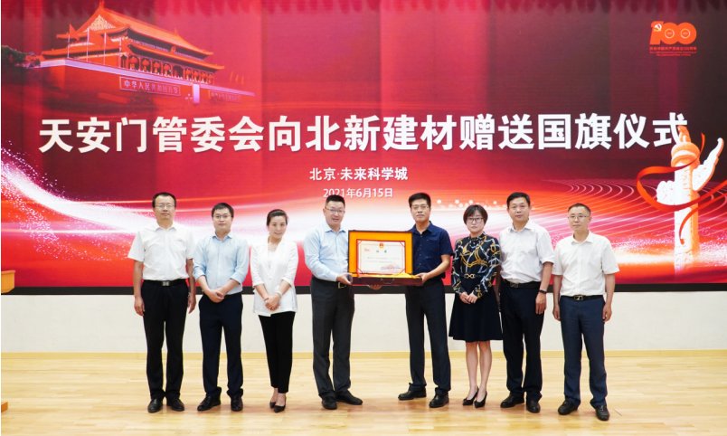 6月15日,北京市天安門地區(qū)管委會(huì)向北新建材贈(zèng)送國(guó)旗儀式在北新科學(xué)院舉行。天安門地區(qū)管委會(huì)副主任柴海泉、基建處處長(zhǎng)楊瑩向北新建材贈(zèng)送國(guó)旗和《東方紅·天安門圖史》,北新建材黨委書記、董事長(zhǎng)王兵代表北新建材接受國(guó)旗。2019年是新中國(guó)成立70周年,這面國(guó)旗是2019年8月28日北新建材成立四十周年當(dāng)天天安門廣場(chǎng)升掛過(guò)的國(guó)旗,對(duì)于北新建材具有更加特殊的意義,將在北新建材永久珍藏。