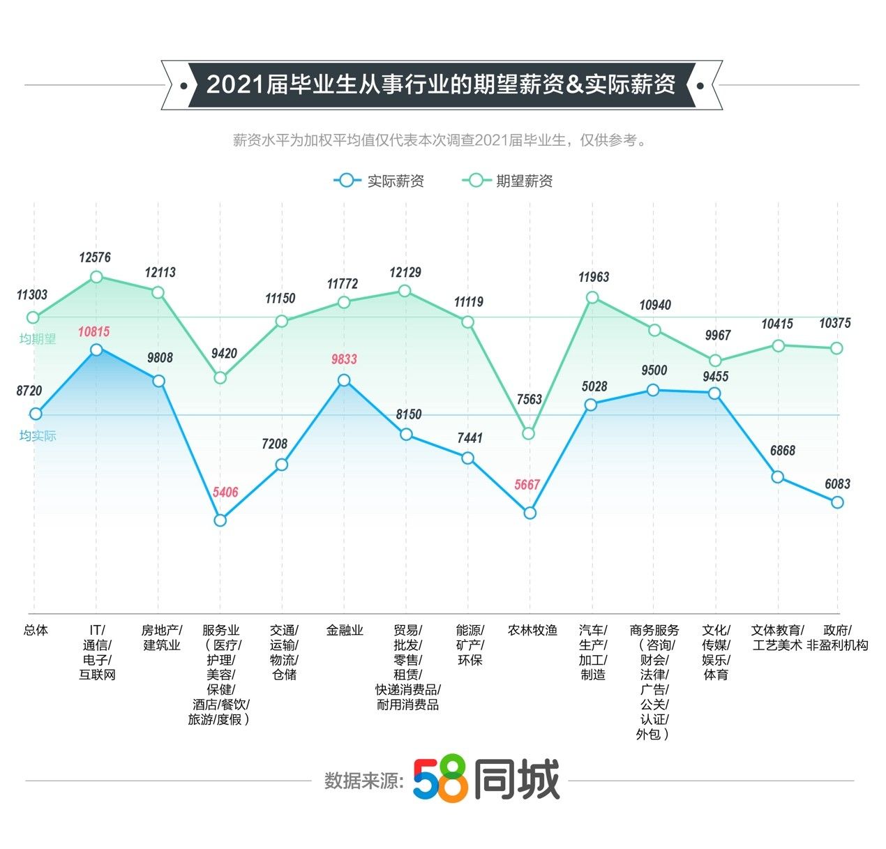58同城《2021年高校畢業(yè)生就業(yè)報(bào)告》顯示,2021屆畢業(yè)生的理想薪資與實(shí)際收入存在差距。一線畢業(yè)生平均稅前薪資為11223元,新一線畢業(yè)生平均稅前薪資7716元。與實(shí)際薪資相比,畢業(yè)生的期望薪資更高,一線與新一線畢業(yè)生的期望薪資分別為13308元和10564元??梢娕c就業(yè)機(jī)會(huì)相比,畢業(yè)生普遍傾向于對(duì)薪資作出讓步,待工作成熟、更優(yōu)質(zhì)就業(yè)機(jī)會(huì)出現(xiàn)再做打算。
