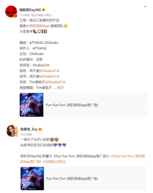 6月7日,楊和蘇KeyNG的最新單曲《Fun Fun Fun》在QQ音樂和網(wǎng)易云音樂正式上線。 歌曲一上線哈粉坐不住了,魔性旋律“Hush yeah,Have some Fun,美的美居have Fun,Let us have Fun ”廣大網(wǎng)友直呼太上頭,這個夏天猝不及防被硬核直男楊和蘇“治愈”了。
