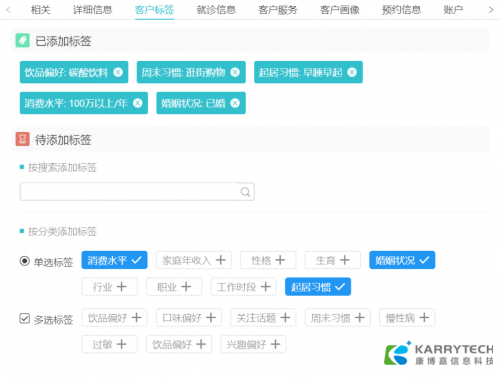 “離客戶再近一點”,康博嘉專注于醫(yī)療領(lǐng)域的醫(yī)院客戶關(guān)系管理系統(tǒng)(HCRM),以醫(yī)院客戶管理為核心,支持數(shù)據(jù)化標簽管理,通過人工+系統(tǒng)標注標簽,不斷完善客戶畫像,并通過RFM模型,令醫(yī)療機構(gòu)管理者在足夠了解客戶的基礎(chǔ)上,定制套餐、折扣以及會員體系,完成院前-院中-院后的客戶服務(wù)閉環(huán),充分挖掘客戶價值,帶動產(chǎn)品的銷售,將價值服務(wù)精準送達高價值的客戶。