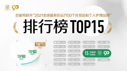 今年5月,全球領(lǐng)先品牌評級機(jī)構(gòu)品牌金融 (Brand Finance)發(fā)布“2021全球最有價(jià)值的50個(gè)化妝品和個(gè)人護(hù)理品牌”排行榜,百雀羚躍升成為該排行榜歷年TOP15中首個(gè)上榜,也是唯一上榜的中國品牌。