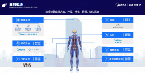 具體來看,方案將建筑的智慧化與人做類比,目標(biāo)是構(gòu)造出建筑的頭腦、心臟、皮膚、骨骼、呼吸系統(tǒng)、代謝系統(tǒng)及神經(jīng)系統(tǒng),將建筑打造成為一個有溫度、可感知、會思考的生命體。美的樓宇科技研究院進(jìn)行信息化、數(shù)字化的大腦處理,提供頂層規(guī)劃設(shè)計的全智慧服務(wù);美控智慧建筑操控是由三大神經(jīng)系統(tǒng)構(gòu)成的數(shù)智平臺;美通能源提供能源動力循環(huán)系統(tǒng)對建筑心臟提供造血;美的和CLIVET雙品牌線的暖通空調(diào)猶如建筑的呼吸系統(tǒng)產(chǎn)生自凈效力;菱王電梯負(fù)責(zé)保障物流人流信息暢通,以產(chǎn)生積極的運輸代謝作用;再加上建筑設(shè)計、工藝結(jié)構(gòu)的骨骼系統(tǒng)和動態(tài)感知、動作執(zhí)行的皮膚肌肉系統(tǒng),方案將建筑打造為城市中必不可少的有機(jī)“生命體”。