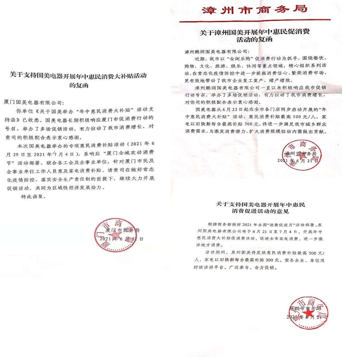 近日,響應號召,推動“拉內需,促消費”的政府惠民政策落地,閩西南國美于6月22日開啟“年中惠民消費大補貼”活動,持續(xù)到7月4日。該項活動得到了廈門、泉州、漳州等當?shù)厣虅站株懤m(xù)發(fā)文響應。