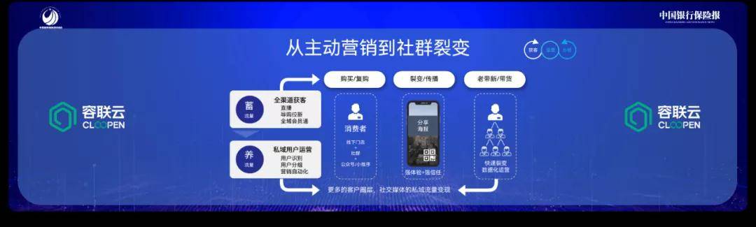 在獲客端,容聯(lián)云幫助企業(yè)建立以營銷為視角的企業(yè)資源庫,對企業(yè)自身掌握的第一手數(shù)據(jù)進行整合,以便進行細分客戶的圈定和經(jīng)營。容聯(lián)云推出了基于私域流量營銷的運營工具聚客平臺,通過建立不同特征的群組進行保險理念的分享和傳播,獲取客戶的保險需求和保障缺口,連接智能保顧的工具或者保險商城進行促成和轉(zhuǎn)化。