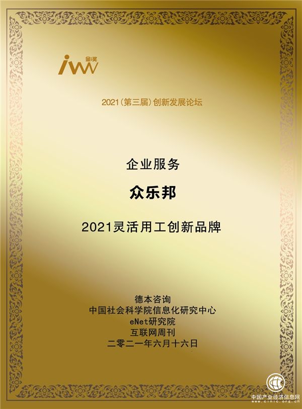 也因此,不久前由中國(guó)社會(huì)科學(xué)院信息化研究中心、eNet研究院、《互聯(lián)網(wǎng)周刊》聯(lián)合主辦“2021(第三屆)創(chuàng)新發(fā)展論壇”的關(guān)注度格外之高。據(jù)了解,此次活動(dòng)以“分享創(chuàng)新成就與案例,全面推進(jìn)數(shù)字化轉(zhuǎn)型”為主題,通過(guò)聚焦各領(lǐng)域企業(yè)過(guò)去的創(chuàng)新成就,遴選優(yōu)秀創(chuàng)新型企業(yè)。優(yōu)稅貓旗下靈活用工交易鑒證平臺(tái)眾樂(lè)邦作為數(shù)字化轉(zhuǎn)型創(chuàng)新案例,入選了《2021企業(yè)創(chuàng)新發(fā)展白皮書(報(bào)告)》,并榮獲大會(huì)頒發(fā)的金i獎(jiǎng)“靈活用工創(chuàng)新品牌獎(jiǎng)”。