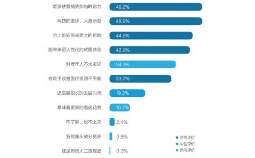 在用戶已有一定感知的基礎上,我們調(diào)研了其對智慧醫(yī)院的價值認知。結(jié)果顯示,近一半的用戶認為智慧醫(yī)院能夠使看病更加省時省力,能帶來更人性化的就醫(yī)體驗,是科技進步的體現(xiàn),是大勢所趨。其余用戶大多也對智慧醫(yī)院價值給予了不同的正向評價。