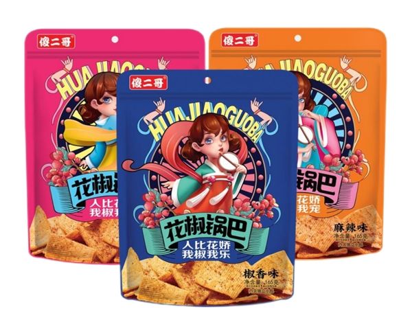 花椒鍋巴立足于備受90后喜愛的國潮風(fēng),迎合年輕消費(fèi)者群體的重口味,以花椒入味對傳統(tǒng)鍋巴進(jìn)行創(chuàng)新。傻二哥研發(fā)團(tuán)隊(duì)歷經(jīng)三個(gè)月時(shí)間反復(fù)調(diào)試、盲品,方成就了這一口獨(dú)一無二、不可復(fù)制的酥硬香脆的花椒鍋巴。椒香味、麻辣味、爆辣味這三種口味滿足了不同人群的味蕾需求。傳統(tǒng)花椒與經(jīng)典鍋巴的結(jié)合帶來了全新的口感體驗(yàn),入口嘎嘣脆爽,勁道爽口有嚼勁,是傻二哥花椒鍋巴與眾不同的點(diǎn)睛之處。為了最大化地激發(fā)年輕消費(fèi)群體的購買欲,花椒鍋巴從年輕人的視角出發(fā),提取了三條能引起共鳴的品牌文案:人比花嬌,我椒我造;人比花嬌,我椒我樂;人比花嬌,我椒我寵;突出90后的個(gè)體意識(shí)與獨(dú)特人格魅力,喚醒他們內(nèi)心深處的記憶。