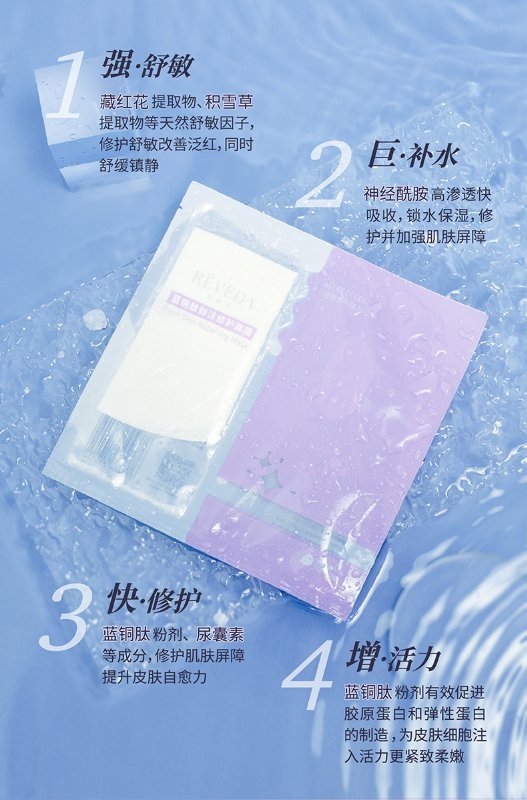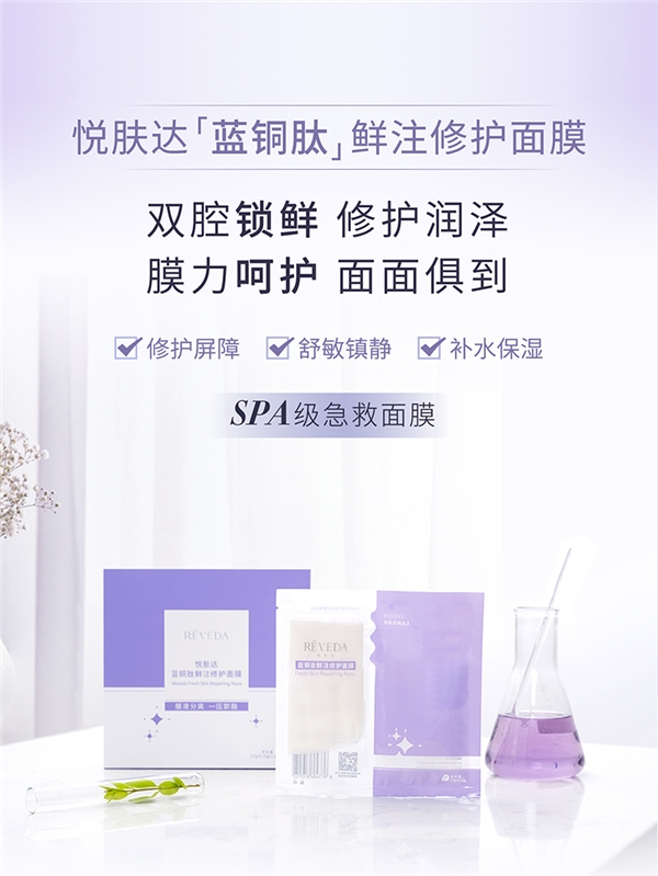 堅持“極簡配方、極高效率、極致安全”的護膚理念,本次悅膚達推出的藍銅肽鮮注修護面膜,更是以溫和且功效顯著的藍銅肽、神經(jīng)酰胺、積雪草提取物、藏紅花提取物等極簡功效成分為主,幫助修護屏障、舒敏潤澤,有效幫助解決肌膚敏感、肌膚屏障受損人群的護膚困擾。