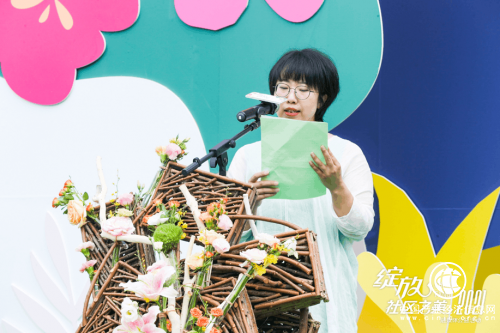 春華秋實、水潤萬物,萬物生發(fā)。四季之美,源于色彩;萬物之美,源于生命;社區(qū)之美,源于向往。半圓球體象征地球和環(huán)境,承載著家、承載著社區(qū)、承載著國的美好寓意。作品彰顯出硬與柔的對比、簡與繁的對比,寓意生活的不同狀態(tài),體現(xiàn)各種狀態(tài)的美。現(xiàn)場嘉賓共同完成名為 “萬物生發(fā)”的花藝作品,預(yù)示著活動正式啟動。