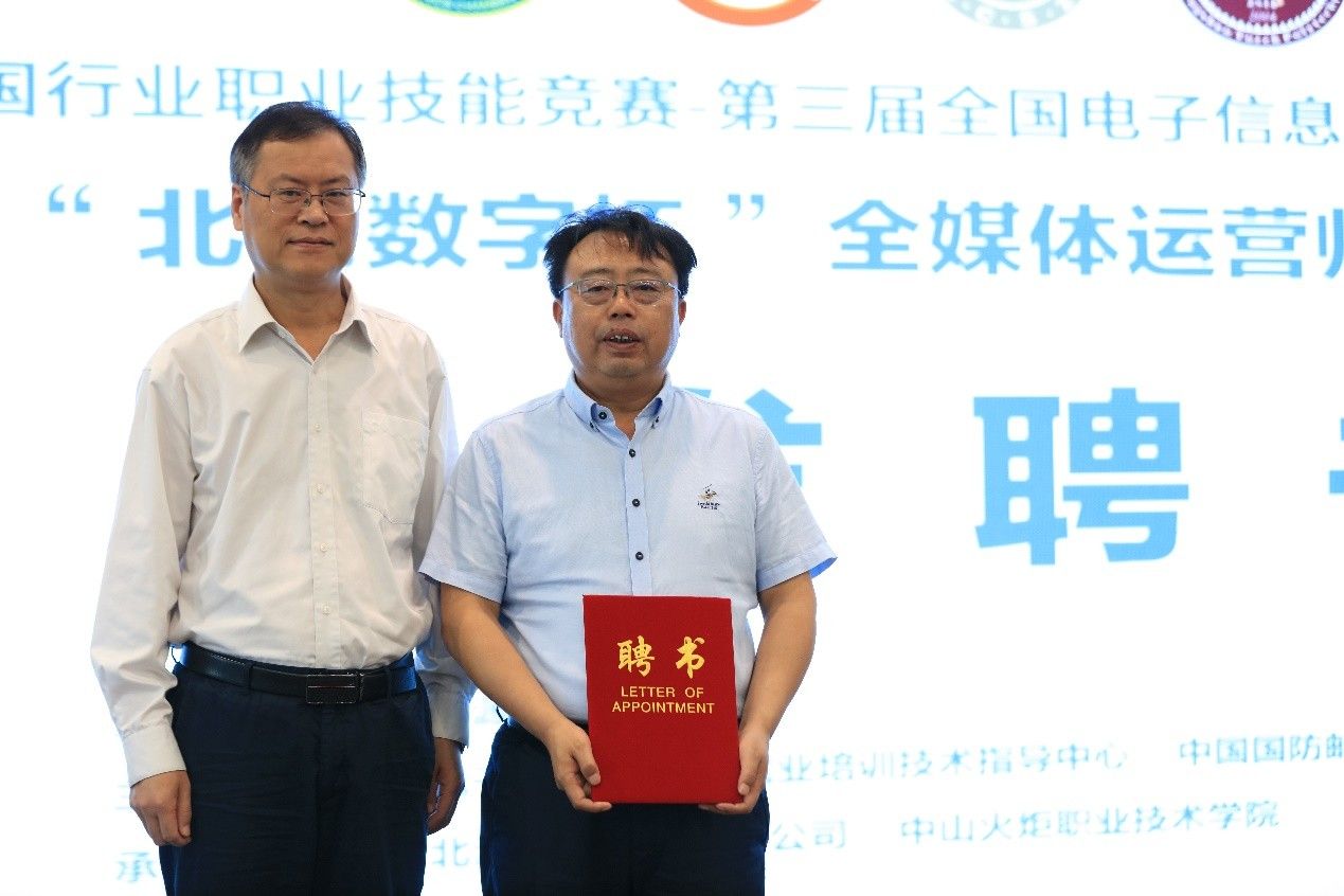 【人力資源和社會保障部職業(yè)能力建設(shè)司副司長劉新昌為中國傳媒大學(xué)高等職業(yè)技術(shù)學(xué)院院長、碩士生導(dǎo)師,教授,屈善孝頒發(fā)全媒體運營師賽項專家委員會主任聘書】