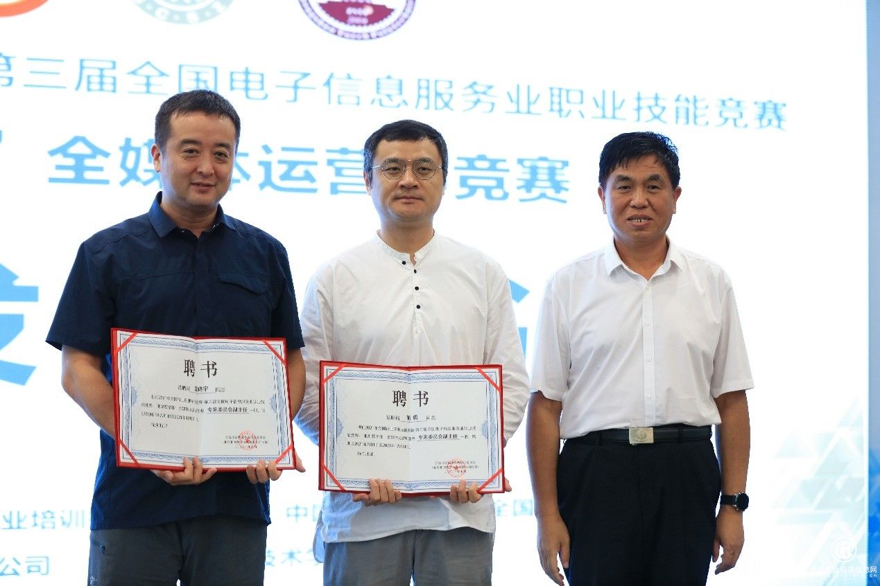 【中國電子商會周明主任為北京聯(lián)合大學(xué)機(jī)器人學(xué)院綜合研發(fā)創(chuàng)新中心主任盛鴻宇、北京航空航天大學(xué)新媒體藝術(shù)與設(shè)計學(xué)院副院長胡勇頒發(fā)全媒體運營師賽項專家委員會副主任聘書】