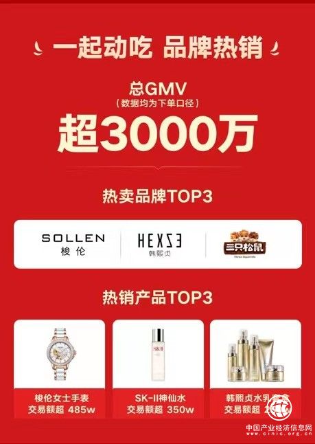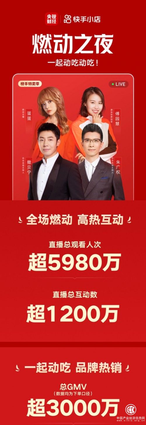 7月29日晚6點-9點,央視主持人撒貝寧、朱廣權(quán)跨界擔(dān)當(dāng)“金牌推銷員”,攜手快手平臺辛選主播蛋蛋、游泳世界冠軍傅園慧亮相“燃動之夜”直播間,一起“動吃動吃”,為觀眾帶來一場饕餮盛宴。本場直播以超3000萬的銷售額完美收官,超過5980萬人次收看了本場直播,互動數(shù)量突破1200萬。
