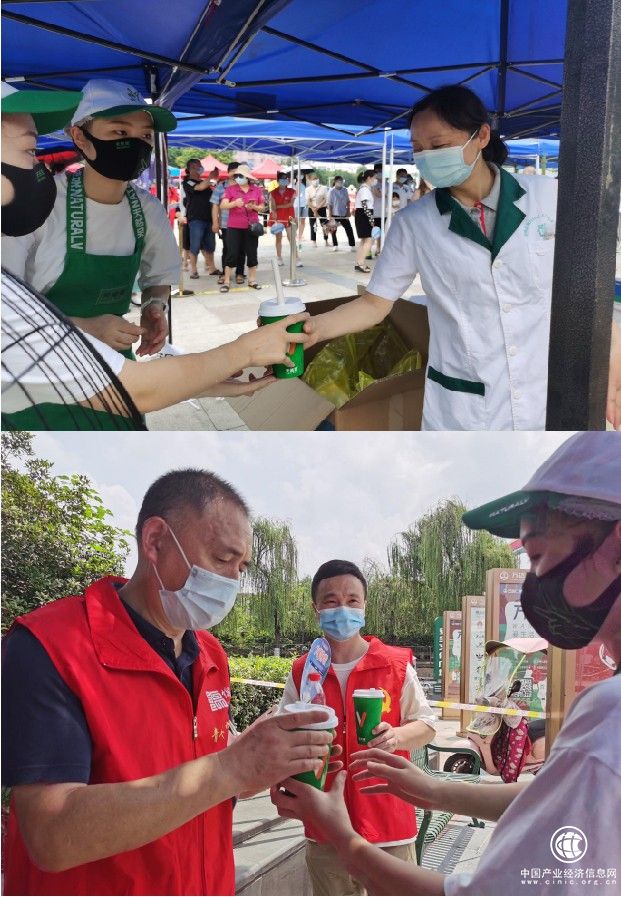 在綿陽,記者現(xiàn)場(chǎng)直擊----天然呆奶茶門店工作人員冒著38度高溫,為一線核酸檢測(cè)人員及社區(qū)志愿者發(fā)放免費(fèi)解暑飲品。