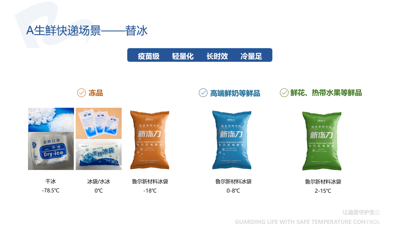 以生鮮快遞場景為例,魯爾新材冰袋可替代水冰或干冰。魯爾新材的冰袋采用優(yōu)質(zhì)的相變儲能材料為核心原料,該相變材料是目前國內(nèi)唯一一家通過德國相變材料質(zhì)量協(xié)會(huì)(簡稱“RAL”)認(rèn)證的材料,具有“儲能容量大、相變精度高、過冷度低和循環(huán)穩(wěn)定性強(qiáng)”的四大特性,通俗的理解為在特定的溫場環(huán)境中,可做到溫度全程浮動(dòng)范圍±1℃,且循環(huán)使用最高可達(dá)10000次。