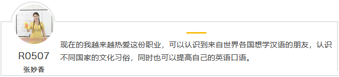 當(dāng)我看到學(xué)生慢慢從英語(yǔ)和我對(duì)話,到一半中文一半英語(yǔ),最后到用中文簡(jiǎn)單對(duì)話。這使我覺(jué)得特別有成就感?,F(xiàn)在的我越來(lái)越熱愛(ài)國(guó)際漢語(yǔ)教師這份職業(yè),可以認(rèn)識(shí)到來(lái)自世界各國(guó)想學(xué)漢語(yǔ)的朋友,認(rèn)識(shí)不同國(guó)家的文化習(xí)俗,同時(shí)也可以提高自己的英語(yǔ)口語(yǔ)。