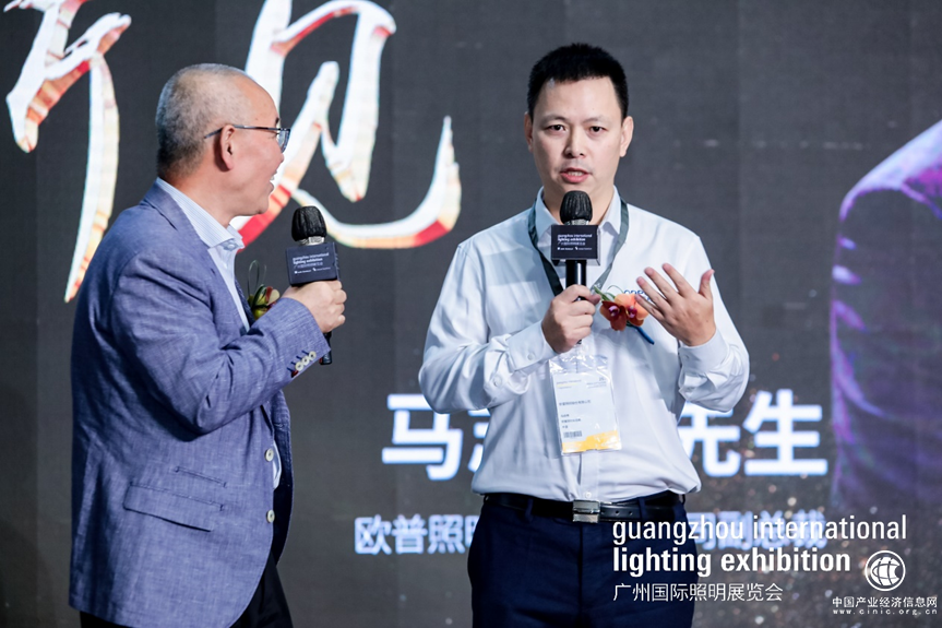 國(guó)家半導(dǎo)體照明工程研發(fā)及產(chǎn)業(yè)聯(lián)盟副理事長(zhǎng)唐國(guó)慶先生(左一)對(duì)話歐普照明副總裁馬志偉先生(右一)
