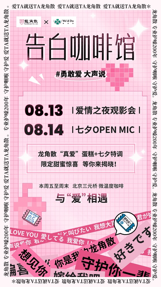 愛要細(xì)心耕耘,更要勇敢表達(dá)。8月6日至11日,龍角散在全網(wǎng)發(fā)起了主題為“勇敢愛大聲說”的七夕告白征集活動(dòng),鼓勵(lì)大家勇敢表達(dá)愛意,回憶愛的甜蜜瞬間。截至8月11日,活動(dòng)已征集近千名網(wǎng)友的甜蜜告白,龍角散精選部分真情告白打造了獨(dú)一無二的甜蜜告白展,并歡迎每一位來到“告白咖啡館”的用戶親手寫下自己的告白,讓自己的心聲被所愛之人聽到。