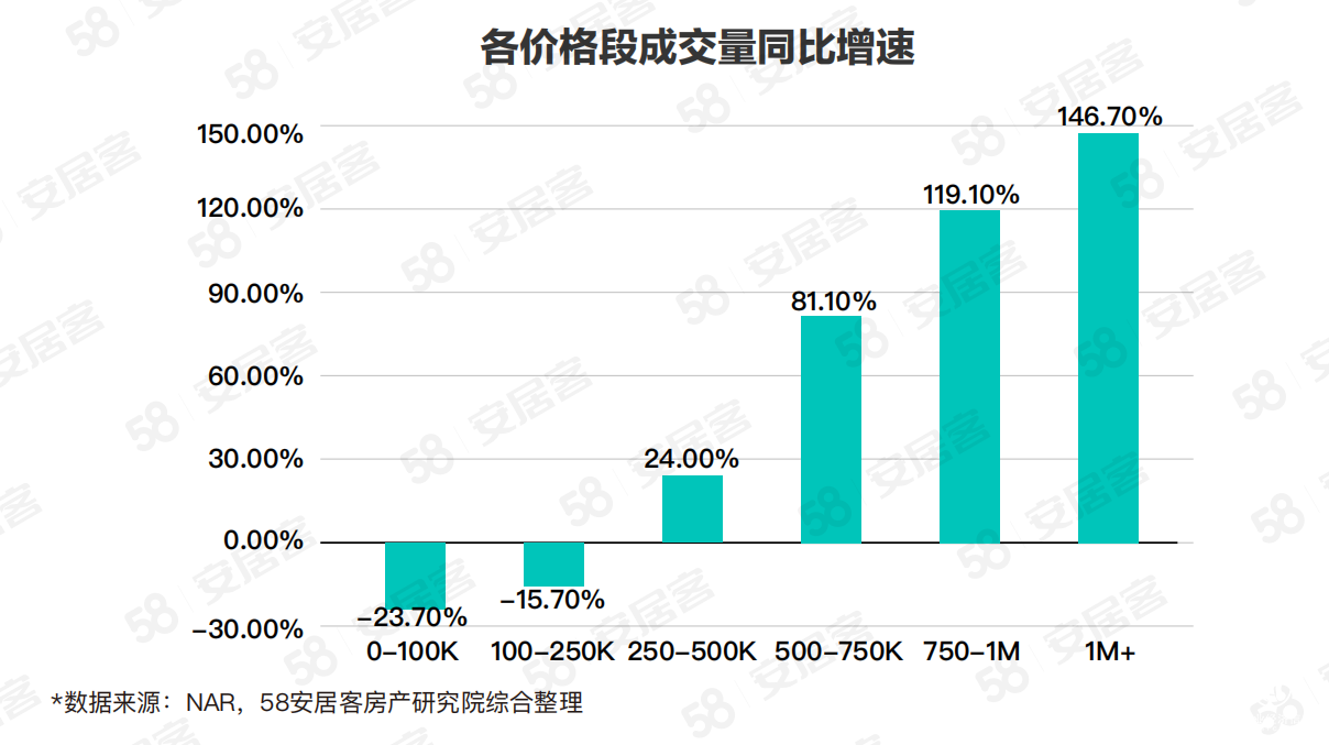 根據全美經紀人協(xié)會的數據顯示,6月份25萬美元以下房屋成交合計占比28%,其中10萬美元以下房產成交比去年同期下降近1/4,10-25萬美元成交下滑15.7%。25萬美元以上各價格段的房屋成交量,總價越高增速也越為顯著,其中100萬美元以上房屋成交占比7%,同比增長146.7%;75-100萬美元占比6%,增長119.1%;50-75萬美元占比16%,增幅81%;成交占比最大的是25-50萬美元的房產,約合43%,增長24%。由此可見,上半年美國房地產市場延續(xù)了去年的高企勢態(tài)。