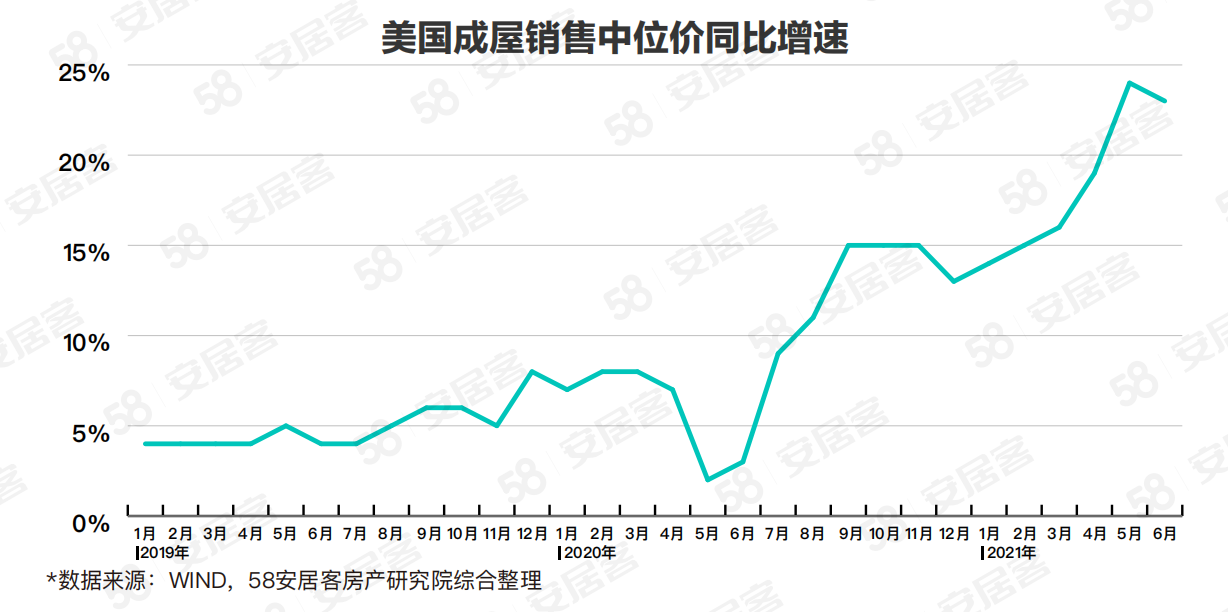 6月美國成屋銷售中位價為36.33萬美元,環(huán)比增長3.68%,同比增長23.4%。去年5月至今,成屋銷售中位價的同比漲幅從1.91%不斷攀升至當前的23.4%,增速顯著。新屋及成屋價格增速依然堅挺,但當前增速和高點相比已有回落,或許意味著拐點初現(xiàn)。