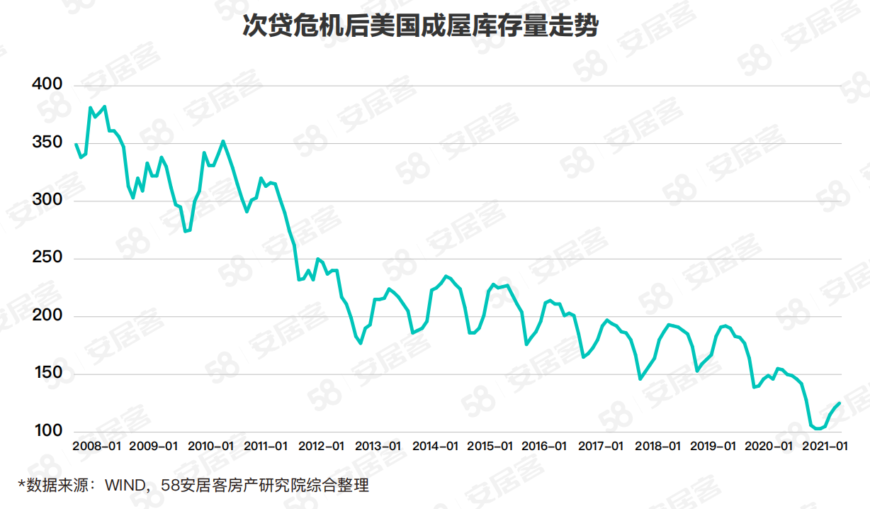 而美國本輪房價上漲最重要的原因是房產市場的供不應求。次貸危機后,建商深陷泥沼自顧不暇,成屋銷售市場的大量庫存也使得建商供給熱情不足。08年以來,市場不斷消耗庫存,疫情爆發(fā)前房屋庫存已是低位。疫情后,遠程辦公催生的住房需求疊加低利率環(huán)境的推波助瀾,需求“超預期”增長導致嚴重的供不應求,引發(fā)房價暴漲。