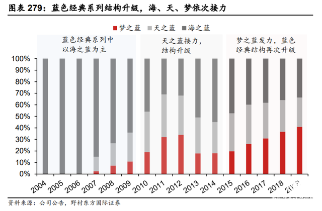 順應(yīng)消費升級的趨勢,天之藍(lán)、夢之藍(lán)依次接力,結(jié)構(gòu)持續(xù)升級2008-2011 年天之藍(lán)的收入貢獻(xiàn)占比逐漸提升,接棒海之藍(lán)成為營收增長貢獻(xiàn)的主力,2012 年營收占比達(dá) 25%。與此同時,夢之藍(lán)系列產(chǎn)品陸續(xù)推出:2005 年夢之藍(lán) 5A 級落地,2010 年裂變推出 M3/M6/M9 單品,2017 年推出超高端產(chǎn)品“手工班”,2019 年年中推出戰(zhàn)略單品 M6+,由此公司形成了次高端+高端+超高端的完整產(chǎn)品矩陣。
