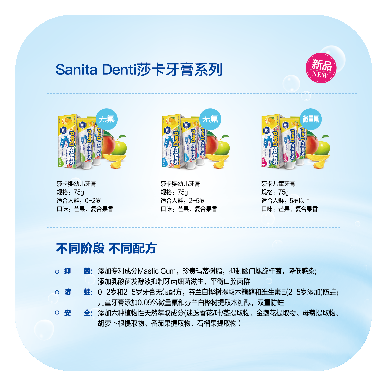莎卡牙膏針對嬰幼兒不同階段牙膏,防蛀成分不同。莎卡0-5歲的嬰幼兒牙膏,牙膏配方適合寶寶此階段發(fā)育特點,不會自出吐泡沫,所以莎卡1階段0-2歲,2階段2-5歲牙膏不含氟,采用100%天然木糖醇防蛀。所以莎卡1階段和2階段牙膏不含氟,寶寶誤吞也安全。