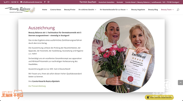 德國著名美容院(Beauty Balance),是從1995年創(chuàng)立并延續(xù)至今的“德國明星美容院”,為此德國美容研究院還為Beauty Balance頒發(fā)了“Derma-Beauty-Star”獎項,全德國僅200家美容院擁有,在德國美容業(yè)界享有很高的榮譽。