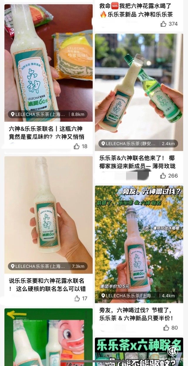 六神X樂樂茶全新推出的聯(lián)名飲品“薄荷玫瓏冰椰椰”特地設計的全新包裝,不同于一般的杯裝茶飲,還沒入口就能聯(lián)想到六神帶來的一股清涼,因此被網(wǎng)友們戲稱為“花露水奶茶”。