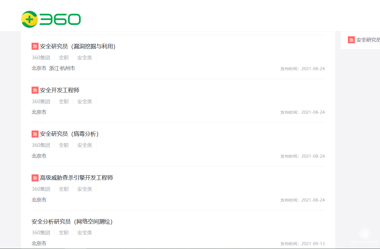 “安全星”計劃外,360在這一輪校園招聘還發(fā)布了20個安全類相關崗位,包括“安全研究員”“安全開發(fā)工程師”“高級威脅查殺引擎開發(fā)工程師”“網(wǎng)絡安全規(guī)劃設計師”等多個重點職位,覆蓋“漏洞挖掘與利用”“病毒分析”“網(wǎng)絡空間測繪”等高精尖細分領域。