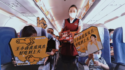 你以為“飛雞上天”只有一段廣告?那你就too young too naive了,王小鹵還真定制了一架自己的雞爪主題包機(jī),成功將虎皮鳳爪送到了天上去!如果你恰巧買到了這架飛機(jī)的機(jī)票,在取票區(qū)就先有一波雞爪樣品誘惑你,接著臨上飛機(jī)發(fā)現(xiàn)自己上的是王小鹵專機(jī),連機(jī)艙內(nèi)的口播語音都有王小鹵的沙雕廣告詞,正當(dāng)你一臉不屑,心說有本事整點(diǎn)實(shí)在的呢?飛機(jī)上還真就給大家發(fā)了王小鹵聯(lián)合同程的零食禮包!在枯燥乏味的飛行時(shí)光里,將一款美味的肉類零食送到客戶手上,無疑會(huì)得到消費(fèi)者的青睞。