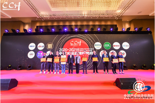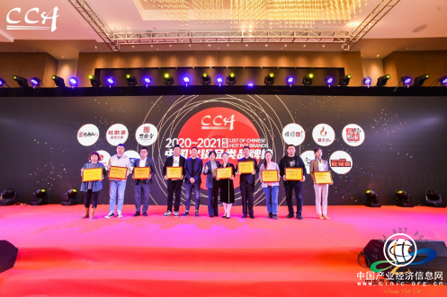 天財商龍CEO孫洪霞(左六)為“2020-2021中國火鍋品類品牌榜”獲獎品牌頒獎