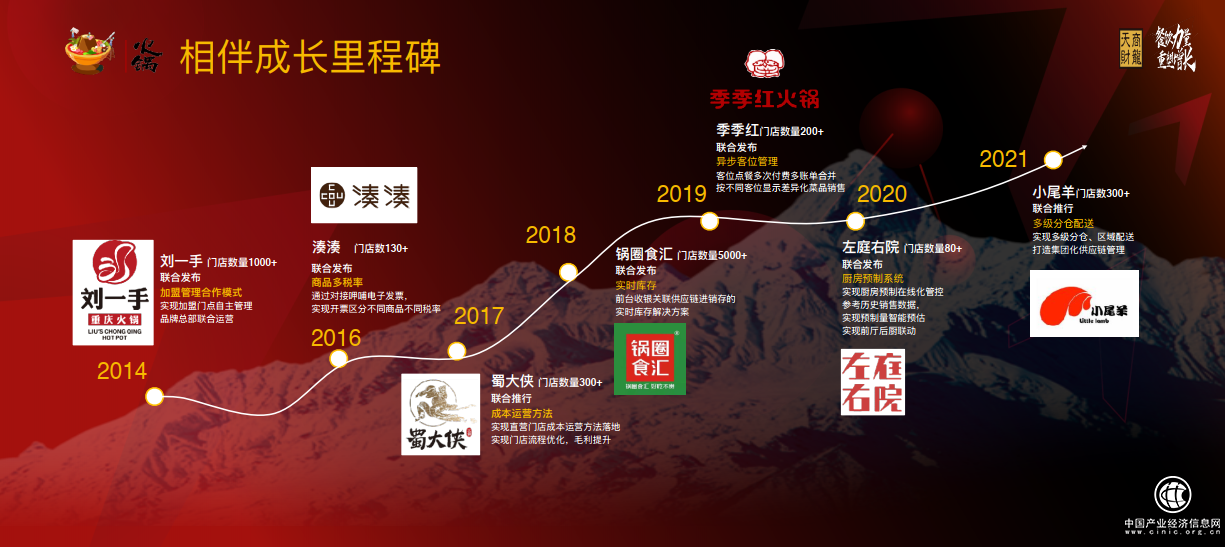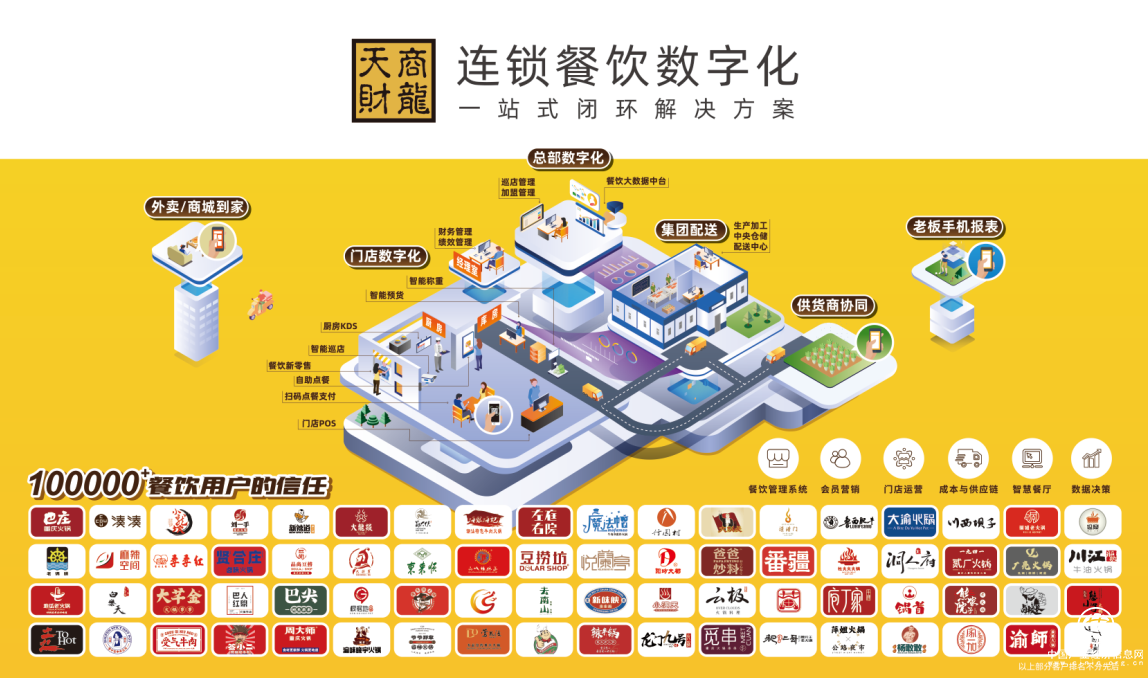 目前,天財商龍火鍋數(shù)字化解決方案已經(jīng)為劉一手、大渝火鍋、左庭右院、大龍燚、蜀大俠、珮姐老火鍋、湊湊、季季紅、新辣道、順水魚館、麻辣空間、老碼頭火鍋、品尚豆撈、賢合莊鹵味火鍋、巴莊重慶火鍋等全國眾多連鎖火鍋餐飲品牌提供企業(yè)級產(chǎn)品與服務(wù),通過完善的連鎖餐飲數(shù)字化一站式閉環(huán)解決方案,與火鍋餐企攜手成長,助力餐飲產(chǎn)業(yè)數(shù)字化升級,為企業(yè)強大連鎖發(fā)展保駕護航!