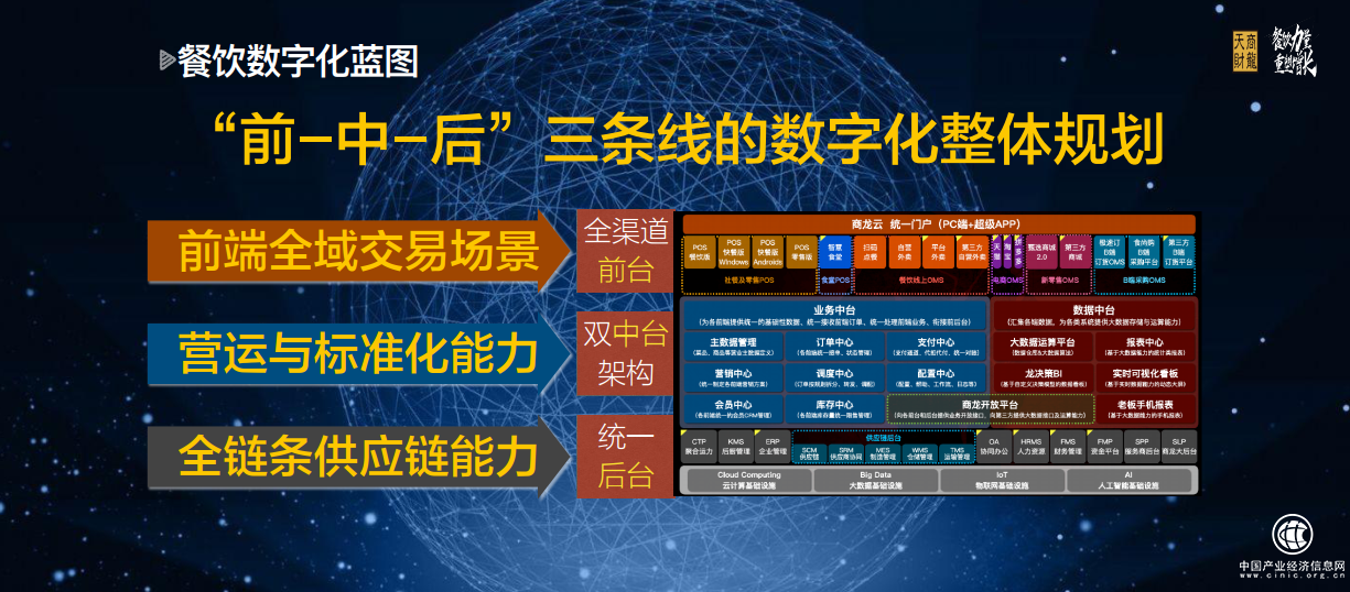 孫總強調(diào),火鍋餐飲企業(yè)在進行數(shù)字化轉(zhuǎn)型升級的時候,要重視數(shù)字化的整體規(guī)劃,建立數(shù)字化交通樞紐,才能讓各部門的信息鏈接打通,形成整體。因此,餐飲企業(yè)需要構(gòu)建的是包含前端交易場景、營運與標準化能力及全鏈條供應(yīng)鏈能力的“前-中-后”三條線的餐飲經(jīng)營全域數(shù)字化藍圖。