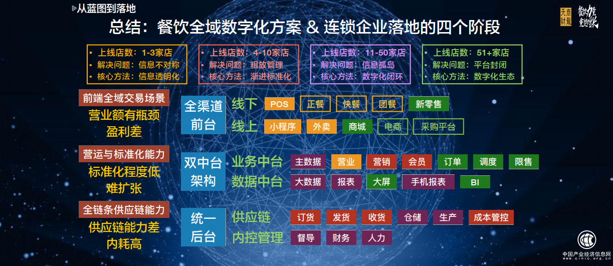 最后,在談到數(shù)字化藍圖的落地方法時,孫總指出餐飲企業(yè)需要對自身有清晰的認知,明確自己的發(fā)展方向,才能進行有計劃、有步驟、有戰(zhàn)略的數(shù)字化轉(zhuǎn)型升級。并以典型的中小餐飲企業(yè)為例,將餐飲企業(yè)劃分成了4個不同的發(fā)展階段,餐飲企業(yè)需要根據(jù)自己的發(fā)展階段以及未來可預(yù)見的發(fā)展狀況,合理設(shè)計符合企業(yè)需求的數(shù)字化藍圖。