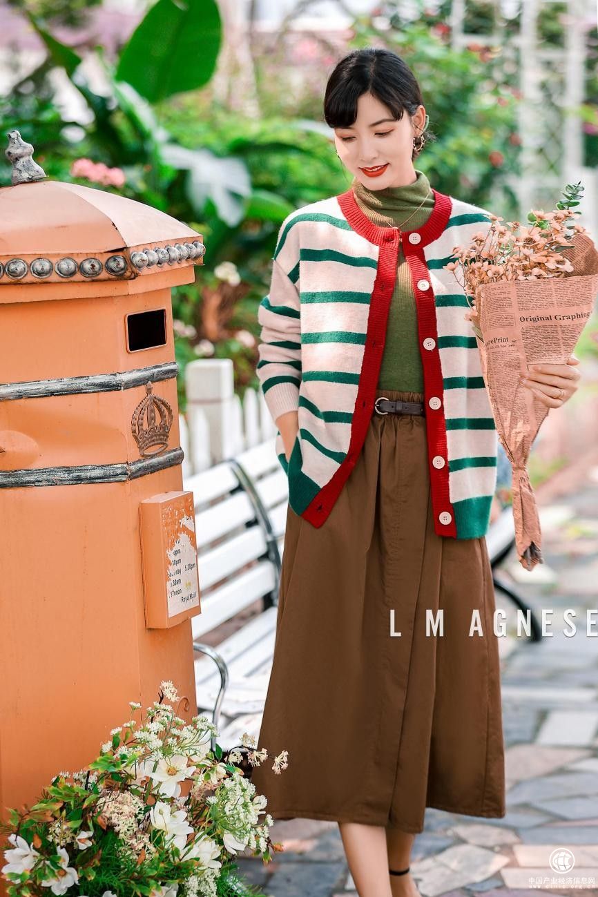 除了碎花,條紋也是時裝設(shè)計(jì)師最愛的元素之一。簡愛格妮斯這款撞色條紋針織衫搭配咖色半身裙和墨綠色針織打底衫,一套搭配很好地詮釋了Easy Chic。內(nèi)搭和外套質(zhì)地都非常柔軟順滑,細(xì)膩的織線給出行的人們帶來了極高的親膚性與透氣性。整套風(fēng)格慵懶中帶了點(diǎn)隨性,優(yōu)雅中帶了點(diǎn)知性,出游穿在身上足夠亮眼吸睛。