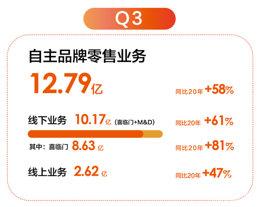 單Q3而言,喜臨門實現營收19.4 億元,同比增幅31.1%;歸母凈利潤1.6億元,同比增幅13.4%;扣非后歸母凈利潤1.5 億,同比增幅10.1%,營收、利潤均超行業(yè)預期。值得一提的是,Q3自主品牌業(yè)務營收達12.79億元,同比2020年增幅為58%。其中,僅喜臨門品牌實現營收8.63億元,同比增幅為81%。