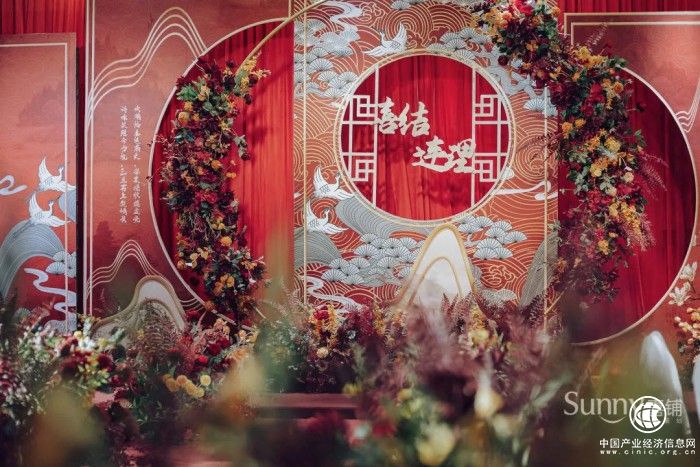此外,傳統(tǒng)中式風選取濃烈的正紅色。花材以大朵的玫瑰、繡球等來搭配中式元素的蘭花,整體造型飽滿熱烈。新中式風則配色大膽,除傳統(tǒng)的紅色外,還可用白色、粉色、米色等淡雅的色彩,花材特點對比傳統(tǒng)中式更濃烈,更多體現(xiàn)了瓶器以及造型感。多選用蘭花、紅梅、樹植等線形花材,量少但精致。