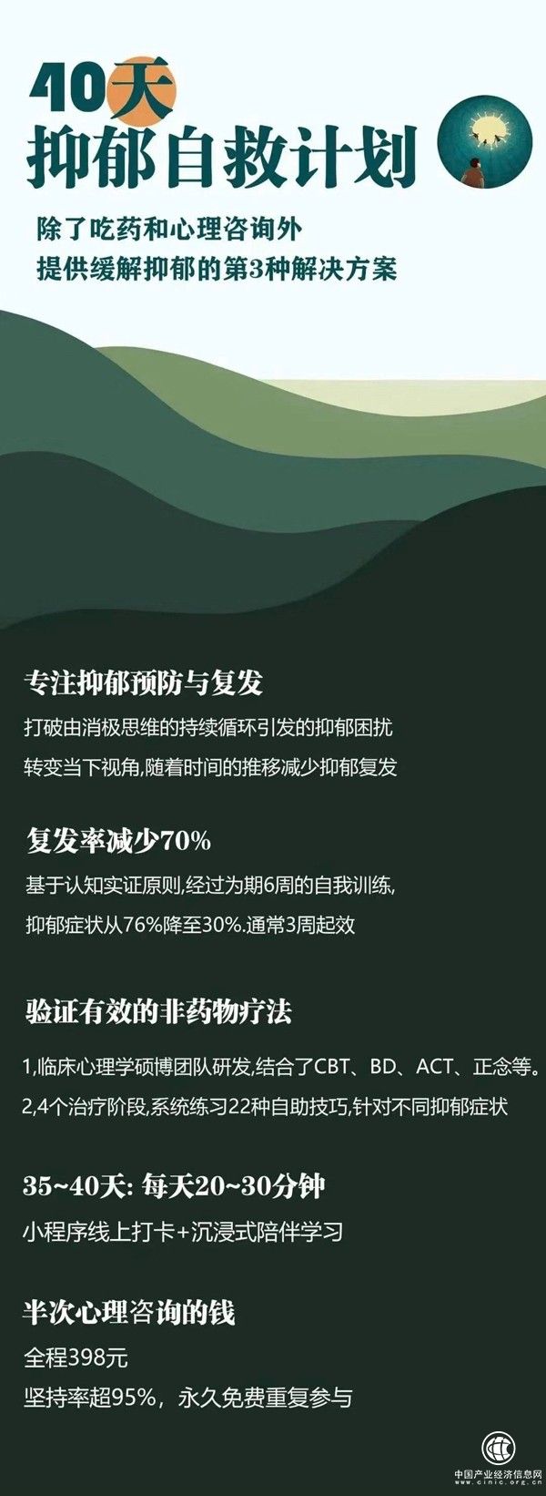 到目前為止,「40天抑郁自救計劃」已經(jīng)服務(wù)了超過 30000名用戶。在一項500名中度至輕度抑郁患者參與試驗中,參與者在為期6周的訓(xùn)練中抑郁癥狀由 76%降到了30%,通常3周內(nèi)得到改善。并且復(fù)發(fā)率的概率比較常規(guī)治療組復(fù)發(fā)率減少70%。即使參與者停止使用,效果仍然存在。公司的目標(biāo)是全面覆蓋精神疾病各個病種,成為國內(nèi)精神疾病數(shù)字療法領(lǐng)域頭部企業(yè)。